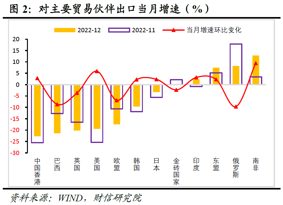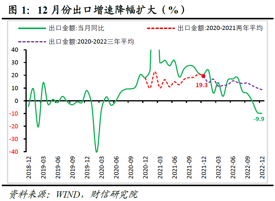 2022年12月份出口金额同比下降9.9%,降幅较上月扩大1.0个百分点(见图1)。从基数效应看,2021年12月份出口两年平均增速为19.3%,低于前值1.7个百分点,表明前两年12月份出口基数走低,不能解释出口增速的回落。我们需从其他角度探讨出口增速回落的原因。