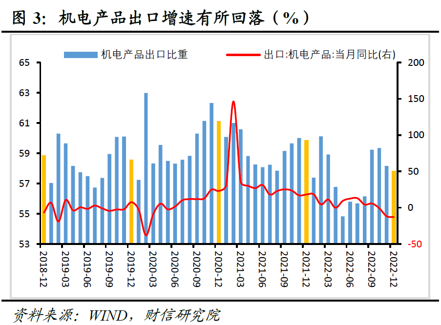 二是分产品看,机电产品贡献了出口增速环比降幅的7成左右。12月份机电产品出口同比下降12.9%,低于上月1.2个百分点,对出口当月增速的拉动作用较上月回落0.7个百分点,贡献了出口增速环比降幅的7成左右,是出口增速回落的主因。12月份机电产品占总出口的比重为57.8%,较上月和2019年同期分别回落0.3和0.7个百分点,表明机电产品对我国出口的支撑作用较疫情前有所走弱(见图3)。