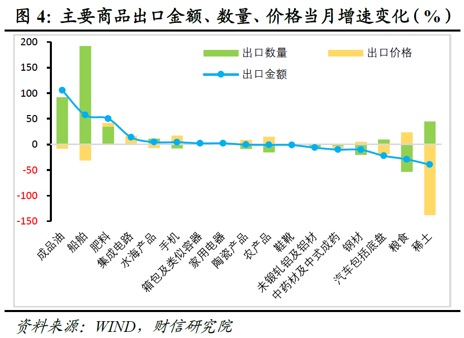 三是分数量和价格看,价格因素对出口增速回落的贡献更大。由于出口价格指数和出口数量指数公布时间滞后,我们通过监测重点商品的出口金额和出口数量的关系,判断数量因素和价格因素对出口的贡献。12月份同时公布数量和价格的17种主要出口商品中,有8种商品出口数量增速回落,有9种商品价格增速回落,下降种类数相差不多,但从下降幅度看,价格因素对出口增速回落的贡献或更大(见图4)。