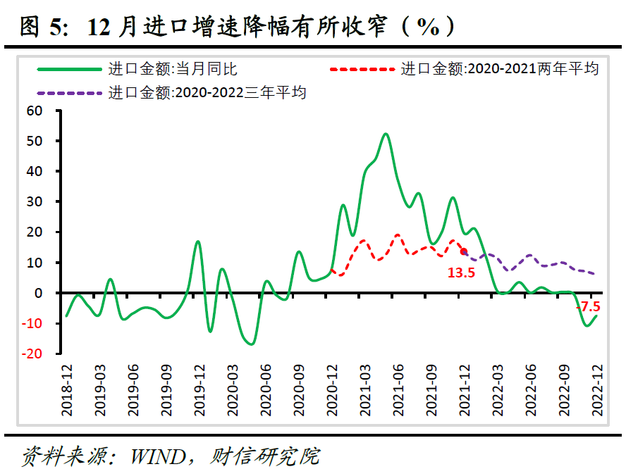2022年12月份进口金额同比下降7.5%,降幅较上月收窄3.1个百分点,增速处于2021年以来低位(见图5)。从基数效应看,2021年12月份进口两年平均增速为12.2%,低于前值3.7个百分点,显示出前两年12月进口基数走低,能部分解释进口增速的回升。