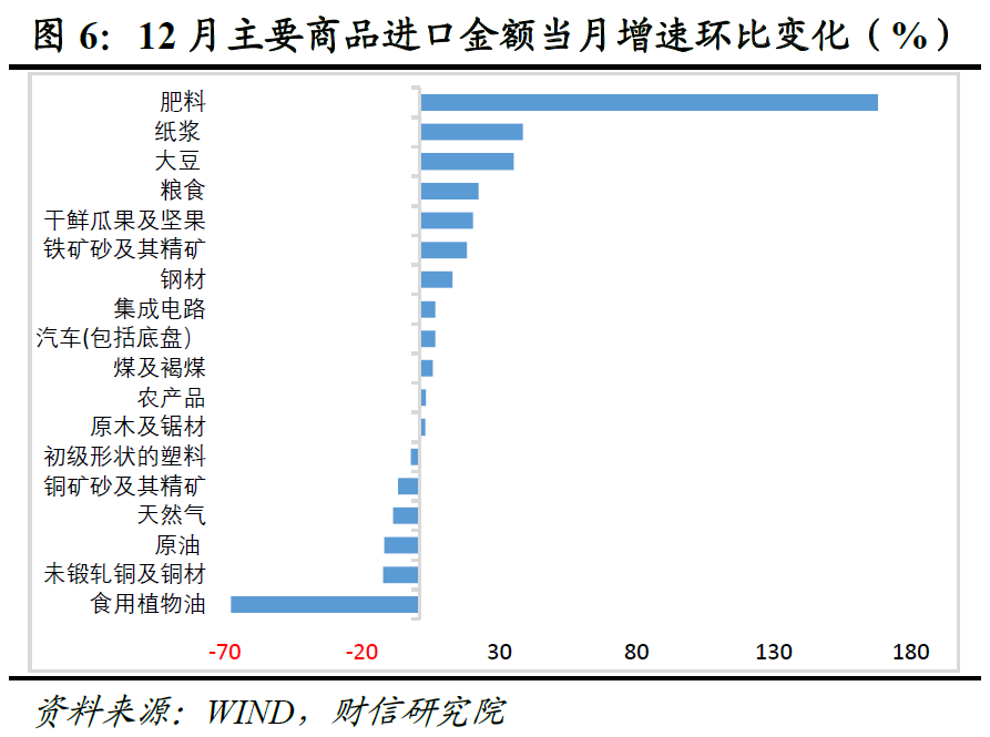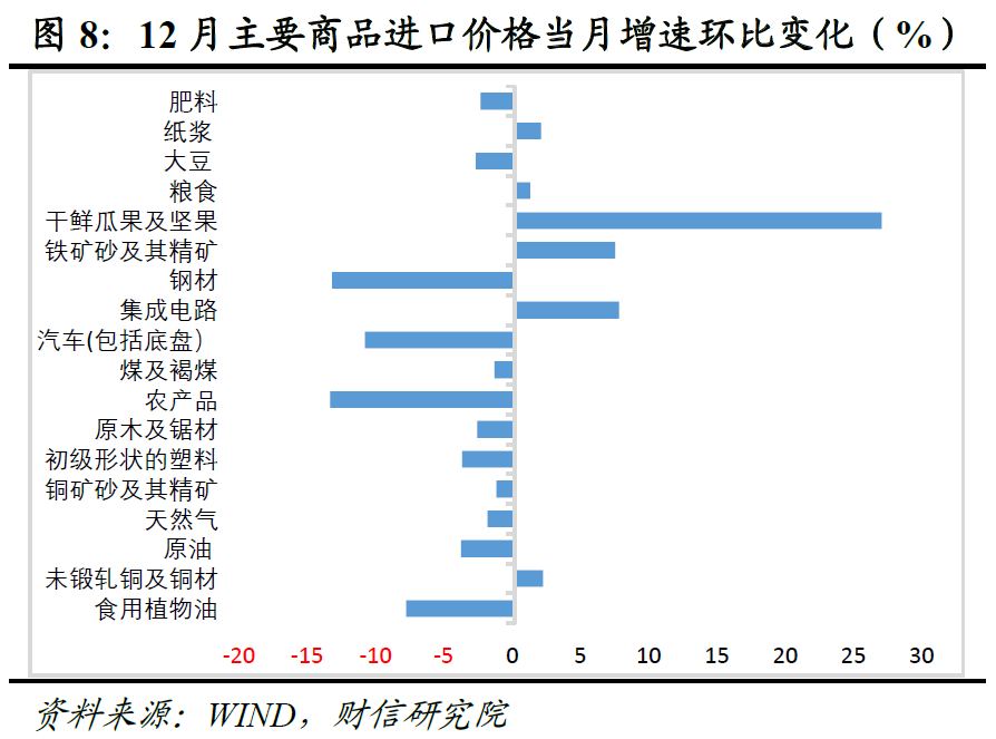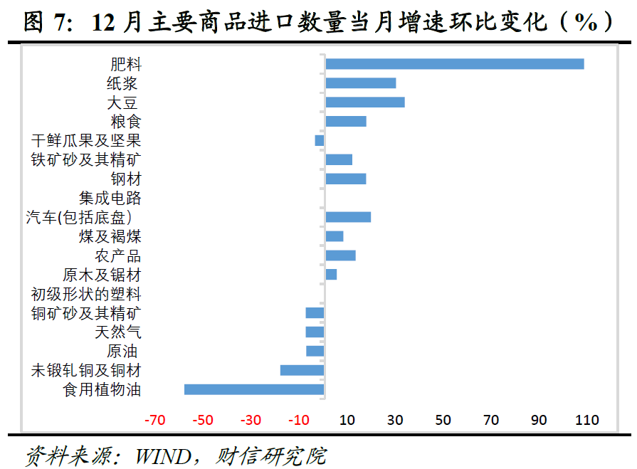 农产品和部分建材支撑数量增速环比回升,但国内需求依然疲弱。分产品看,12月铁矿砂及其精矿、钢材、原木及锯材进口数量增速出现回升,或与国内基建项目赶工和保交楼政策见效有关;肥料、大豆、粮食等农产品进口数量增速提高,相关商品价格回落以及国内粮食能源安全工作持续推进或是主要原因。整体看,12月份进口增速环比回升的品种主要集中在农产品和部分建材商品上,且建材商品进口数量绝对增速仍为负,说明国内需求整体依然疲弱,预计随着国内防疫政策进一步优化,国内需求回暖将对进口数量增速形成支撑。