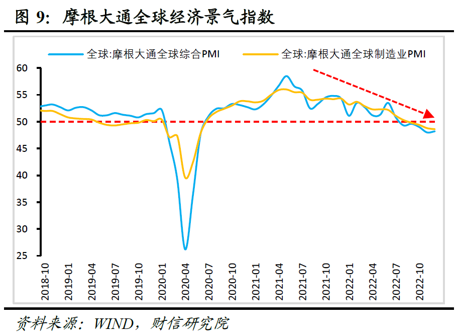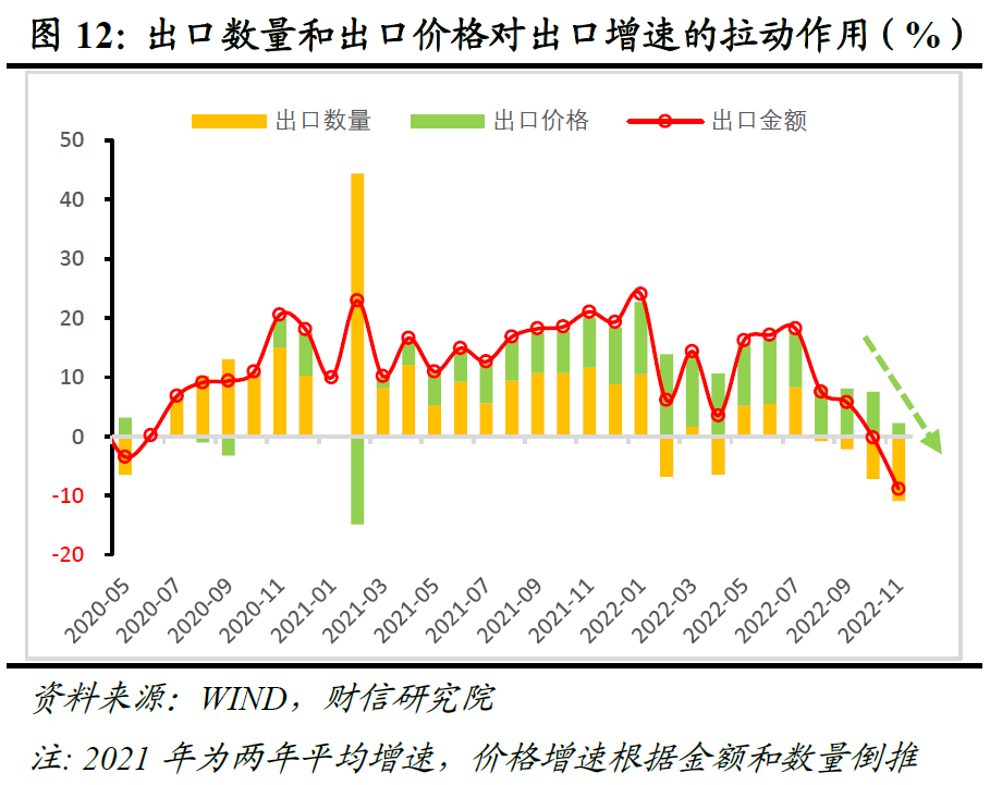 二是预计2023年价格因素对出口的支撑将由正转负。在全球经济衰退风险加剧的背景下,大宗商品价格已经有所走弱,预计未来这一趋势或延续,加之2022年出口价格指数基数较高,预计未来出口价格同比增速大概率逐渐转负,对出口的支撑作用减弱(见图12)。