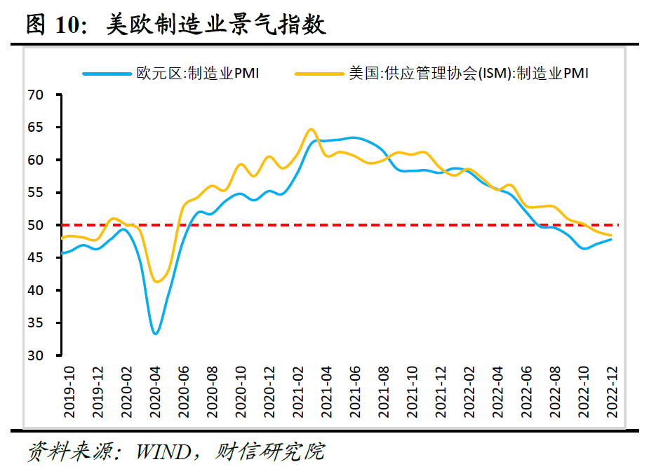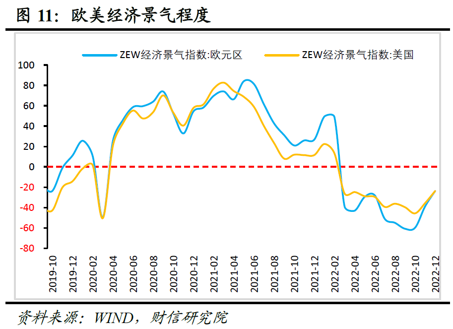 一是预计全球需求放缓对出口数量的拖累有所增强。2022年12月份摩根大通全球综合PMI、全球制造业PMI指数录得48.2%、48.6%,分别较11月份提高0.2和回落0.2个百分点,延续2021年下半年以来的下降态势(见图9),且分别连续5个月和4个月低于临界值,显示受地缘冲突持续发酵、全球通胀压力高企、发达经济体货币政策收紧等影响,全球经济复苏动能边际趋缓。其中12月份美国、欧元区等主要发达经济体制造业PMI指数为48.4%、47.8%,分别较上月回落0.6和提高0.7个百分点,且分别连续2个月和6个月位于收缩区间,指向欧美两大经济体经济放缓压力进一步加大(见图10)。同时,全球经济预期转差,如12月份欧元区、美国ZEW经济景气指数分别录得-23.6%、-23.6%(见图11),分别较11月份提高15.1和11.9个百分点,两者继续为负,显示出对未来6个月欧元区、美国的预期仍在进一步恶化。